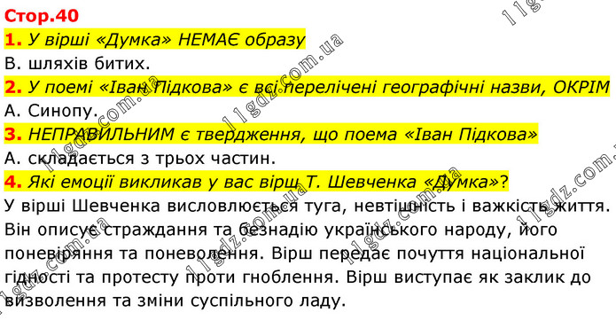 1. У вірші «Думка» НЕМАЄ образу В. шляхів битих. 2. У поемі «Іван Підкова» є всі перелічені географічні назви, ОКРІМ А. Синопу. 3. НЕПРАВИЛЬНИМ є твердження, що поема «Іван Підкова» А. складається з трьох частин. 4. Які емоції викликав у вас вірш Т. Шевченка «Думка»? У вірші Шевченка висловлюється туга, невтішність і важкість життя. Він описує страждання та безнадію українського народу, його поневіряння та поневолення. Вірш передає почуття національної гідності та протесту проти гноблення. Вірш виступає як заклик до визволення та зміни суспільного ладу.