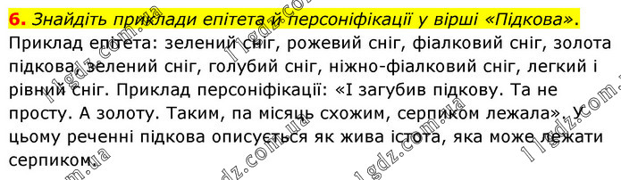 Знайдіть приклади епітета й персоніфікації у вірші «Підкова». Приклад епітета: зелений сніг, рожевий сніг, фіалковий сніг, золота підкова, зелений сніг, голубий сніг, ніжно-фіалковий сніг, легкий і рівний сніг. Приклад персоніфікації: «І загубив підкову. Та не просту. А золоту. Таким, па місяць схожим, серпиком лежала». У цьому реченні підкова описується як жива істота, яка може лежати серпиком.
