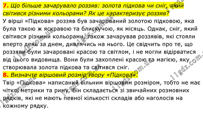 7. Що більше зачарувало роззяв: золота підкова чи сніг, який світився різними кольорами? Як це характеризує роззяв? У вірші «Підкова» роззяв був зачарований золотою підковою, яка була такою ж яскравою та блискучою, як місяць. Однак, сніг, який світився різними кольорами, також зачарував роззявів, які стояли вперто день за днем, дивлячись на нього. Це свідчить про те, що роззяви були зачаровані красою та світлом, і не могли відірватися від цього видовища. Вони були захоплені красою та магією, яку створювала золота підкова та світився сніг. 8. Визначте віршовий розмір твору «Підкова». Твір «Підкова» написаний вільним віршовим розміром, тобто не має чіткої метрики та риму. Він складається зі звичайних розмовних рядків, які не мають певної кількості складів або наголосів на кожному рядку.