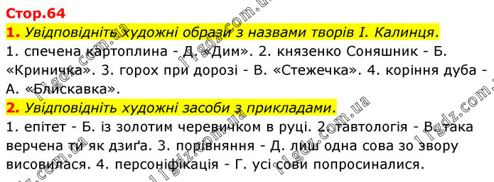 1. Увідповідніть художні образи з назвами творів І. Калинця. 1. спечена картоплина - Д. «Дим». 2. князенко Соняшник - Б. «Криничка». 3. горох при дорозі - В. «Стежечка». 4. коріння дуба - А. «Блискавка». 2. Увідповідніть художні засоби з прикладами. 1. епітет - Б. із золотим черевичком в руці. 2. тавтологія - В. така верчена ти як дзиґа. 3. порівняння - Д. лиш одна сова зо звору висовилася. 4. персоніфікація - Г. усі сови попросиналися.
