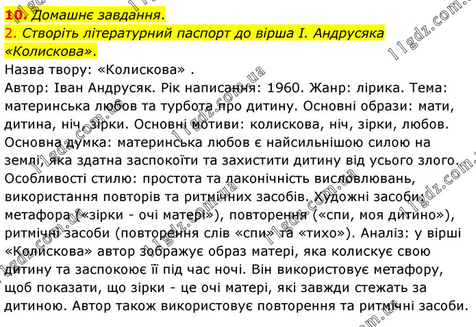 Домашнє завдання. 2. Створіть літературний паспорт до вірша І. Андрусяка «Колискова». Назва твору: «Колискова» . Автор: Іван Андрусяк. Рік написання: 1960. Жанр: лірика. Тема: материнська любов та турбота про дитину. Основні образи: мати, дитина, ніч, зірки. Основні мотиви: колискова, ніч, зірки, любов. Основна думка: материнська любов є найсильнішою силою на землі, яка здатна заспокоїти та захистити дитину від усього злого. Особливості стилю: простота та лаконічність висловлювань, використання повторів та ритмічних засобів. Художні засоби: метафора («зірки - очі матері»), повторення («спи, моя дитино»), ритмічні засоби (повторення слів «спи» та «тихо»). Аналіз: у вірші «Колискова» автор зображує образ матері, яка колискує свою дитину та заспокоює її під час ночі. Він використовує метафору, щоб показати, що зірки - це очі матері, які завжди стежать за дитиною. Автор також використовує повторення та ритмічні засоби.