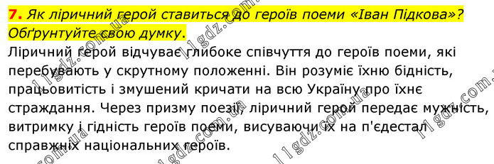 Як ліричний герой ставиться до героїв поеми «Іван Підкова»? Обґрунтуйте свою думку. Ліричний герой відчуває глибоке співчуття до героїв поеми, які перебувають у скрутному положенні. Він розуміє їхню бідність, працьовитість і змушений кричати на всю Україну про їхнє страждання. Через призму поезії, ліричний герой передає мужність, витримку і гідність героїв поеми, висуваючи їх на п'єдестал справжніх національних героїв.