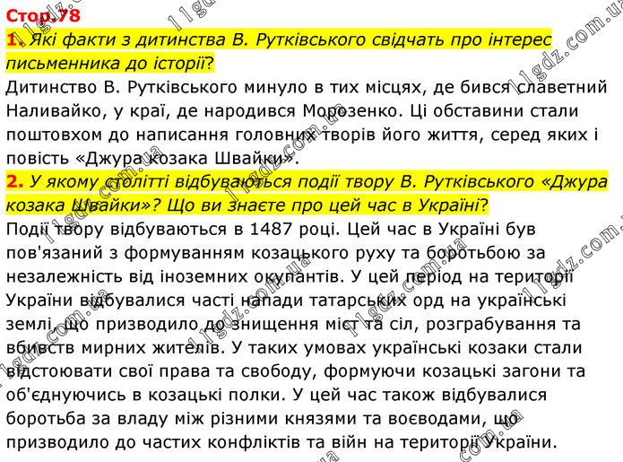 1. Які факти з дитинства В. Рутківського свідчать про інтерес письменника до історії? Дитинство В. Рутківського минуло в тих місцях, де бився славетний Наливайко, у краї, де народився Морозенко. Ці обставини стали поштовхом до написання головних творів його життя, серед яких і повість «Джура козака Швайки». 2. У якому столітті відбуваються події твору В. Рутківського «Джура козака Швайки»? Що ви знаєте про цей час в Україні? Події твору відбуваються в 1487 році. Цей час в Україні був пов'язаний з формуванням козацького руху та боротьбою за незалежність від іноземних окупантів. У цей період на території України відбувалися часті напади татарських орд на українські землі, що призводило до знищення міст та сіл, розграбування та вбивств мирних жителів. У таких умовах українські козаки стали відстоювати свої права та свободу, формуючи козацькі загони та об'єднуючись в козацькі полки. У цей час також відбувалися боротьба за владу між різними князями та воєводами, що призводило до частих конфліктів та війн на території України.