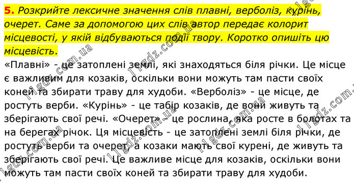 Розкрийте лексичне значення слів плавні, верболіз, курінь, очерет. Саме за допомогою цих слів автор передає колорит місцевості, у якій відбуваються події твору. Коротко опишіть цю місцевість. «Плавні» - це затоплені землі, які знаходяться біля річки. Це місце є важливим для козаків, оскільки вони можуть там пасти своїх коней та збирати траву для худоби. «Верболіз» - це місце, де ростуть верби. «Курінь» - це табір козаків, де вони живуть та зберігають свої речі. «Очерет» - це рослина, яка росте в болотах та на берегах річок. Ця місцевість - це затоплені землі біля річки, де ростуть верби та очерет, а козаки мають свої курені, де живуть та зберігають свої речі. Це важливе місце для козаків, оскільки вони можуть там пасти своїх коней та збирати траву для худоби.