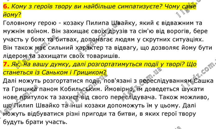6. Кому з героїв твору ви найбільше симпатизуєте? Чому саме йому? Головному герою - козаку Пилипа Швайку, який є відважним та мужнім воїном. Він захищає своїх друзів та сім'ю від ворогів, бере участь у боях та битвах, допомагає людям у скрутних ситуаціях. Він також має сильний характер та відвагу, що дозволяє йому бути лідером та захищати своїх товаришів. 7. Як, на вашу думку, далі розгортатимуться події у творі? Що станеться із Саньком і Грициком? Далі можуть розгортатися події, пов'язані з переслідуванням Сашка та Грицика паном Кобильським. Ймовірно, їм доведеться шукати нове притулок та захист від свого переслідувача. Також можливо, що Пилип Швайко та інші козаки допоможуть їм у цьому. Далі можуть відбуватися різні пригоди та битви, в яких герої твору будуть брати участь.