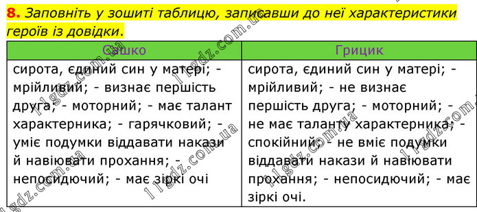 Заповніть у зошиті таблицю, записавши до неї характеристики героїв із довідки. Сашко Грицик сирота, єдиний син у матері; - мрійливий; - визнає першість друга; - моторний; - має талант характерника; - гарячковий; - уміє подумки віддавати накази й навіювати прохання; - непосидючий; - має зіркі очі сирота, єдиний син у матері; - мрійливий; - не визнає першість друга; - моторний; - не має таланту характерника; - спокійний; - не вміє подумки віддавати накази й навіювати прохання; - непосидючий; - має зіркі очі.