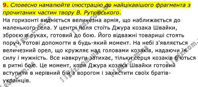Словесно намалюйте ілюстрацію до найцікавішого фрагмента з прочитаних частин твору В. Рутківського. На горизонті видніється величезна армія, що наближається до маленького села. У центрі поля стоїть Джура козака Швайки, зброєю в руках, готовий до бою. Його відважні товариші стоять поруч, готові допомогти в будь-який момент. На небі з'являється величезний орел, що кружляє над головами козаків, надаючи їм силу і мужність. Все навкруги затихає, тільки серця козаків б'ються в ритмі бою. Це момент, коли Джура козака Швайки готовий вступити в нерівний бій з ворогом і захистити своїх братів-українців.