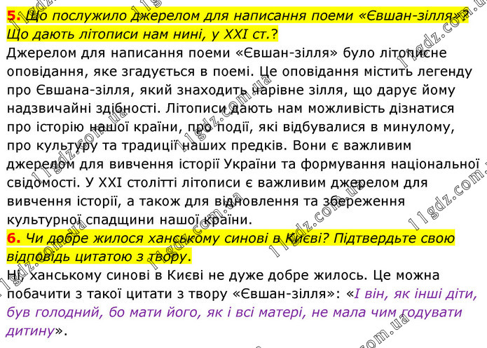 5. Що послужило джерелом для написання поеми «Євшан-зілля»? Що дають літописи нам нині, у XXI ст.? Джерелом для написання поеми «Євшан-зілля» було літописне оповідання, яке згадується в поемі. Це оповідання містить легенду про Євшана-зілля, який знаходить чарівне зілля, що дарує йому надзвичайні здібності. Літописи дають нам можливість дізнатися про історію нашої країни, про події, які відбувалися в минулому, про культуру та традиції наших предків. Вони є важливим джерелом для вивчення історії України та формування національної свідомості. У XXI столітті літописи є важливим джерелом для вивчення історії, а також для відновлення та збереження культурної спадщини нашої країни. 6. Чи добре жилося ханському синові в Києві? Підтвердьте свою відповідь цитатою з твору. Ні, ханському синові в Києві не дуже добре жилось. Це можна побачити з такої цитати з твору «Євшан-зілля»: «І він, як інші діти, був голодний, бо мати його, як і всі матері, не мала чим годувати дитину».