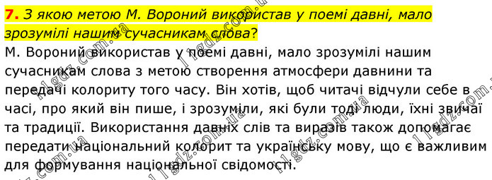 З якою метою М. Вороний використав у поемі давні, мало зрозумілі нашим сучасникам слова? М. Вороний використав у поемі давні, мало зрозумілі нашим сучасникам слова з метою створення атмосфери давнини та передачі колориту того часу. Він хотів, щоб читачі відчули себе в часі, про який він пише, і зрозуміли, які були тоді люди, їхні звичаї та традиції. Використання давніх слів та виразів також допомагає передати національний колорит та українську мову, що є важливим для формування національної свідомості.