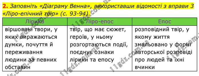 Заповніть «Діаграму Венна», використавши відомості з вправи 3 «Ліро-епічний твір» (с. 93-94). Лірика Ліро-епос Епос віршовані твори, у яких виражаються думки, почуття й переживання людини за певних обставин твір, що має сюжет, героїв, у ньому розгортаються події, поєднує ознаки лірики та епосу розповідний твір, у якому життя змальовано у формі авторської розповіді про людей та їхні вчинки