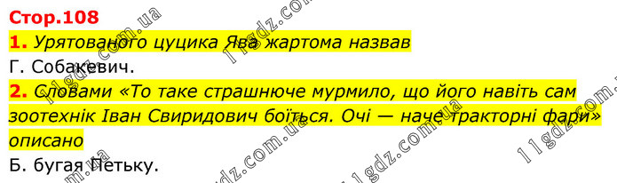 1. Урятованого цуцика Ява жартома назвав Г. Собакевич. 2. Словами «То таке страшнюче мурмило, що його навіть сам зоотехнік Іван Свиридович боїться. Очі — наче тракторні фари» описано Б. бугая Петьку.