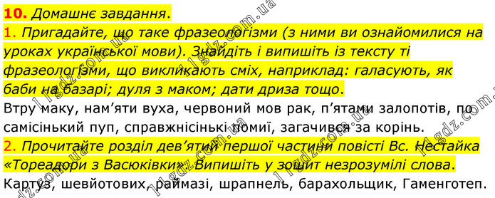 Домашнє завдання. 1. Пригадайте, що таке фразеологізми (з ними ви ознайомилися на уроках української мови). Знайдіть і випишіть із тексту ті фразеологізми, що викликають сміх, наприклад: галасують, як баби на базарі; дуля з маком; дати дриза тощо. Втру маку, нам’яти вуха, червоний мов рак, п’ятами залопотів, по самісінький пуп, справжнісінькі помиї, загачився за корінь. 2. Прочитайте розділ дев’ятий першої частини повісті Вс. Нестайка «Тореадори з Васюківки». Випишіть у зошит незрозумілі слова. Картуз, шевйотових, раймазі, шрапнель, барахольщик, Гаменготеп.