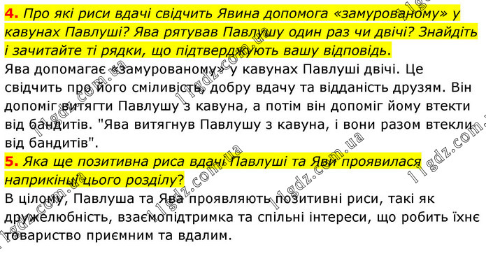 4. Про які риси вдачі свідчить Явина допомога «замурованому» у кавунах Павлуші? Ява рятував Павлушу один раз чи двічі? Знайдіть і зачитайте ті рядки, що підтверджують вашу відповідь. Ява допомагає «замурованому» у кавунах Павлуші двічі. Це свідчить про його сміливість, добру вдачу та відданість друзям. Він допоміг витягти Павлушу з кавуна, а потім він допоміг йому втекти від бандитів. "Ява витягнув Павлушу з кавуна, і вони разом втекли від бандитів". 5. Яка ще позитивна риса вдачі Павлуші та Яви проявилася наприкінці цього розділу? В цілому, Павлуша та Ява проявляють позитивні риси, такі як дружелюбність, взаємопідтримка та спільні інтереси, що робить їхнє товариство приємним та вдалим.