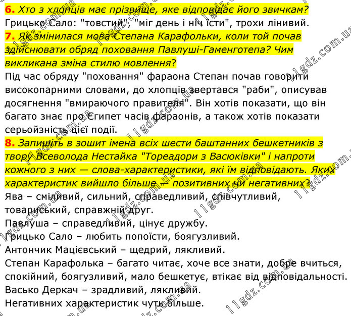 6. Хто з хлопців має прізвище, яке відповідає його звичкам? Грицько Сало: "товстий", "міг день і ніч їсти", трохи лінивий. 7. Як змінилася мова Степана Карафольки, коли той почав здійснювати обряд поховання Павлуші-Гаменготепа? Чим викликана зміна стилю мовлення? Під час обряду "поховання" фараона Степан почав говорити високопарними словами, до хлопців звертався "раби", описував досягнення "вмираючого правителя". Він хотів показати, що він багато знає про Єгипет часів фараонів, а також хотів показати серьойзність цієї події. 8. Запишіть в зошит імена всіх шести баштанних бешкетників з твору Всеволода Нестайка "Тореадори з Васюківки" і напроти кожного з них — слова-характеристики, які їм відповідають. Яких характеристик вийшло більше — позитивних чи негативних? Ява – сміливий, сильний, справедливий, співчутливий, товариський, справжній друг. Павлуша – справедливий, цінує дружбу. Грицько Сало – любить попоїсти, боягузливий. Антончик Мацієвський – щедрий, лякливий. Степан Карафолька – багато читає, хоче все знати, добре вчиться, спокійний, боягузливий, мало бешкетує, втікає від відповідальності. Васько Деркач – зрадливий, лякливий. Негативних характеристик чуть більше.