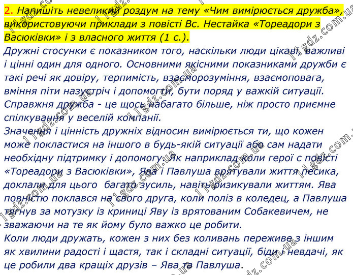 2. Напишіть невеликий роздум на тему «Чим вимірюється дружба», використовуючи приклади з повісті Вс. Нестайка «Тореадори з Васюківки» і з власного життя (1 с.). Дружні стосунки є показником того, наскільки люди цікаві, важливі і цінні один для одного. Основними якісними показниками дружби є такі речі як довіру, терпимість, взаєморозуміння, взаємоповага, вміння піти назустріч і допомогти, бути поряд у важкій ситуації. Справжня дружба - це щось набагато більше, ніж просто приємне спілкування у веселій компанії. Значення і цінність дружніх відносин вимірюється ти, що кожен може покластися на іншого в будь-якій ситуації або сам надати необхідну підтримку і допомогу. Як наприклад коли герої с повісті «Тореадори з Васюківки», Ява і Павлуша врятували життя песика, доклали для цього багато зусиль, навіть ризикували життям. Ява повністю поклався на свого друга, коли поліз в коледец, а Павлуша тягнув за мотузку із криниці Яву із врятованим Собакевичем, не зважаючи на те як йому було важко це робити. Коли люди дружать, кожен з них без коливань переживе з іншим як хвилини радості і щастя, так і складні ситуації, біди і невдачі, як це робили два кращіх друзів – Ява та Павлуша.