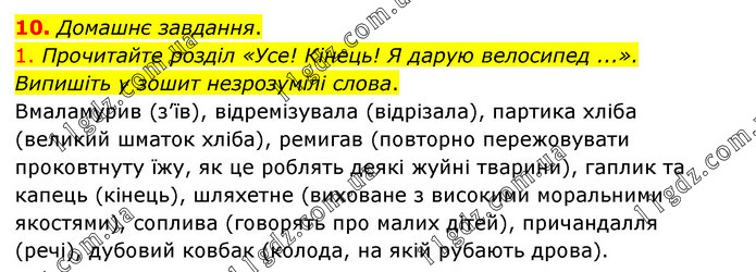 Домашнє завдання. 1. Прочитайте розділ «Усе! Кінець! Я дарую велосипед ...». Випишіть у зошит незрозумілі слова. Вмаламурив (з’їв), відремізувала (відрізала), партика хліба (великий шматок хліба), ремигав (повторно пережовувати проковтнуту їжу, як це роблять деякі жуйні тварини), гаплик та капець (кінець), шляхетне (виховане з високими моральними якостями), соплива (говорять про малих дітей), причандалля (речі), дубовий ковбак (колода, на якій рубають дрова).