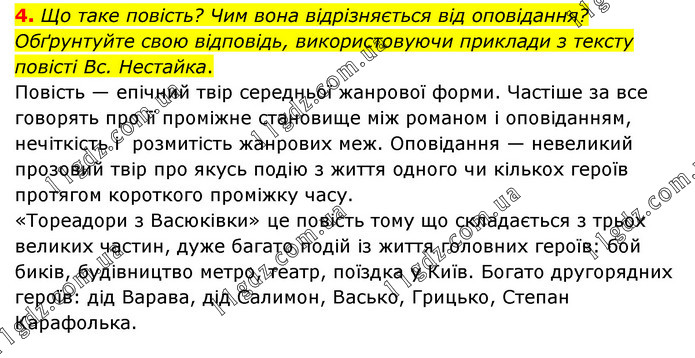 Що таке повість? Чим вона відрізняється від оповідання? Обґрунтуйте свою відповідь, використовуючи приклади з тексту повісті Вс. Нестайка. Повість — епічний твір середньої жанрової форми. Частіше за все говорять про її проміжне становище між романом і оповіданням, нечіткість і розмитість жанрових меж. Оповідання — невеликий прозовий твір про якусь подію з життя одного чи кількох героїв протягом короткого проміжку часу. «Тореадори з Васюківки» це повість тому що складається з трьох великих частин, дуже багато подій із життя головних героїв: бой биків, будівництво метро, театр, поїздка у Київ. Богато другорядних героїв: дід Варава, дід Салимон, Васько, Грицько, Степан Карафолька.