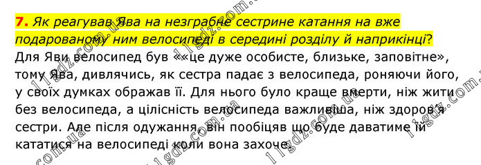 Як реагував Ява на незграбне сестрине катання на вже подарованому ним велосипеді в середині розділу й наприкінці? Для Яви велосипед був ««це дуже особисте, близьке, заповітне», тому Ява, дивлячись, як сестра падає з велосипеда, роняючи його, у своїх думках ображав її. Для нього було краще вмерти, ніж жити без велосипеда, а цілісність велосипеда важливіша, ніж здоров’я сестри. Але після одужання, він пообіцяв що буде даватиме їй кататися на велосипеді коли вона захоче.