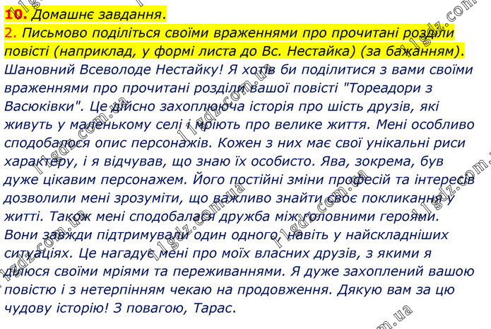 Домашнє завдання. 2. Письмово поділіться своїми враженнями про прочитані розділи повісті (наприклад, у формі листа до Вс. Нестайка) (за бажанням). Шановний Всеволоде Нестайку! Я хотів би поділитися з вами своїми враженнями про прочитані розділи вашої повісті "Тореадори з Васюківки". Це дійсно захоплююча історія про шість друзів, які живуть у маленькому селі і мріють про велике життя. Мені особливо сподобалося опис персонажів. Кожен з них має свої унікальні риси характеру, і я відчував, що знаю їх особисто. Ява, зокрема, був дуже цікавим персонажем. Його постійні зміни професій та інтересів дозволили мені зрозуміти, що важливо знайти своє покликання у житті. Також мені сподобалася дружба між головними героями. Вони завжди підтримували один одного, навіть у найскладніших ситуаціях. Це нагадує мені про моїх власних друзів, з якими я ділюся своїми мріями та переживаннями. Я дуже захоплений вашою повістю і з нетерпінням чекаю на продовження. Дякую вам за цю чудову історію! З повагою, Тарас.