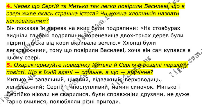 4. Через що Сергій та Митько так легко повірили Василеві, що в озері живе якась страшна істота? Чи можна хлопчиків назвати легковажними? Він показав їм дерева на яких були подряпини: «На стовбурах видніли глибокі подряпини, кореневища двох-трьох дерев були підриті, луска від кори вкривала землю.» Хлопці були легковажними, тому що повірили Василеві, хоча він сам купався в цьому озері. 5. Охарактеризуйте поведінку Митька й Сергія в розділі першому повісті. Що в їхній вдачі — спільне, а що — відмінне? Митько — запальний, цікавий, відважний, верховодиць, легковажний; Сергій — поступливий, мамин синочок. Митько і Сергійко ніколи не сварилися, були справжніми друзями, не дуже гарно вчилися, полюбляли різні пригоди.