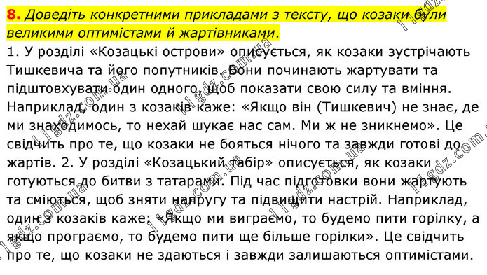 Доведіть конкретними прикладами з тексту, що козаки були великими оптимістами й жартівниками. 1. У розділі «Козацькі острови» описується, як козаки зустрічають Тишкевича та його попутників. Вони починають жартувати та підштовхувати один одного, щоб показати свою силу та вміння. Наприклад, один з козаків каже: «Якщо він (Тишкевич) не знає, де ми знаходимось, то нехай шукає нас сам. Ми ж не зникнемо». Це свідчить про те, що козаки не бояться нічого та завжди готові до жартів. 2. У розділі «Козацький табір» описується, як козаки готуються до битви з татарами. Під час підготовки вони жартують та сміються, щоб зняти напругу та підвищити настрій. Наприклад, один з козаків каже: «Якщо ми виграємо, то будемо пити горілку, а якщо програємо, то будемо пити ще більше горілки». Це свідчить про те, що козаки не здаються і завжди залишаються оптимістами.