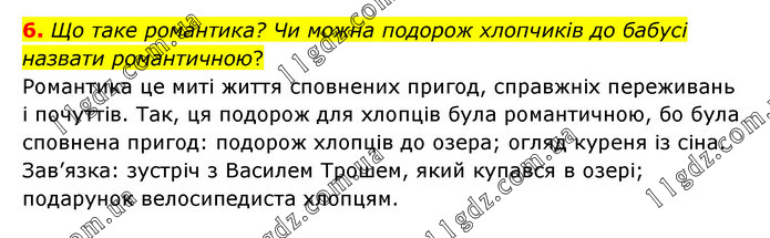 Що таке романтика? Чи можна подорож хлопчиків до бабусі назвати романтичною? Романтика це миті життя сповнених пригод, справжніх переживань і почуттів. Так, ця подорож для хлопців була романтичною, бо була сповнена пригод: подорож хлопців до озера; огляд куреня із сіна. Зав’язка: зустріч з Василем Трошем, який купався в озері; подарунок велосипедиста хлопцям.