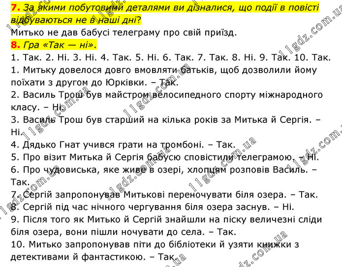 7. За якими побутовими деталями ви дізналися, що події в повісті відбуваються не в наші дні? Митько не дав бабусі телеграму про свій приїзд. 8. Гра «Так — ні». 1. Так. 2. Ні. 3. Ні. 4. Так. 5. Ні. 6. Так. 7. Так. 8. Ні. 9. Так. 10. Так. 1. Митьку довелося довго вмовляти батьків, щоб дозволили йому поїхати з другом до Юрківки. – Так. 2. Василь Трош був майстром велосипедного спорту міжнародного класу. – Ні. 3. Василь Трош був старший на кілька років за Митька й Сергія. – Ні. 4. Дядько Гнат учився грати на тромбоні. – Так. 5. Про візит Митька й Сергія бабусю сповістили телеграмою. – Ні. 6. Про чудовиська, яке живе в озері, хлопцям розповів Василь. – Так. 7. Сергій запропонував Митькові переночувати біля озера. – Так. 8. Сергій під час нічного чергування біля озера заснув. – Ні. 9. Після того як Митько й Сергій знайшли на піску величезні сліди біля озера, вони пішли ночувати до села. – Так. 10. Митько запропонував піти до бібліотеки й узяти книжки з детективами й фантастикою. – Так.
