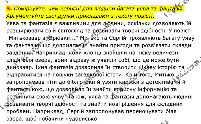 Поміркуйте, чим корисні для людини багата уява та фантазія. Аргументуйте свої думки прикладами з тексту повісті. Уява та фантазія є важливими для людини, оскільки дозволяють їй розширювати свій світогляд та розвивати творчі здібності. У повісті "Митькозавр з Юрківки..." Митько та Сергій проявляють багату уяву та фантазію, що допомагає їм знайти пригоди та розв'язати складні завдання. Наприклад, коли хлопці знайшли на піску величезні сліди біля озера, вони відразу ж уявили собі, що це може бути динозавр. Їхня фантазія дозволила їм створити цікаву історію та відправитися на пошуки загадкової істоти. Крім того, Митько запропонував піти до бібліотеки й узяти книжки з детективами й фантастикою, що дозволило їм знайти корисну інформацію та розвинути свою уяву. Також, уява та фантазія допомагають людині розвивати творчі здібності та знайти нові рішення для складних проблем. Наприклад, Сергій запропонував переночувати біля озера, щоб побачити чудовисько.