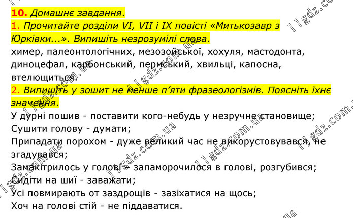 Домашнє завдання. 1. Прочитайте розділи VI, VII і IX повісті «Митькозавр з Юрківки...». Випишіть незрозумілі слова. химер, палеонтологічних, мезозойської, хохуля, мастодонта, диноцефал, карбонський, пермський, хвильці, капосна, втелющиться. 2. Випишіть у зошит не менше п’яти фразеологізмів. Поясніть їхнє значення. У дурні пошив - поставити кого-небудь у незручне становище; Сушити голову - думати; Припадати порохом - дуже великий час не викорустовувався, не згадувався; Замакітрилось у голові – запаморочилося в голові, розгубився; Сидіти на шиї - заважати; Усі повмирають от заздрощів - зазіхатися на щось; Хоч на голові стій - не піддаватися.