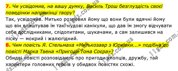 7. Чи усвідомив, на вашу думку, Василь Трош безглуздість своєї поведінки наприкінці твору? Так, усвідомив. Митько розповил йому що вони були вдячні йому що він влаштував їм такі чудові канікули, що дав їм змогу відчувати себе дослідниками, слідопитами, шукачами, а сам залишився на піску — мокрий і жалюгідний. 8. Чим повість Я. Стельмаха «Митькозавр з Юрківки...» подібна до повісті Марка Твена «Пригоди Тома Соєра»? Обидві повісті розповідають про пригоди хлопців, дружбу, тай характери головних героїв у обидвох повістях схожі.