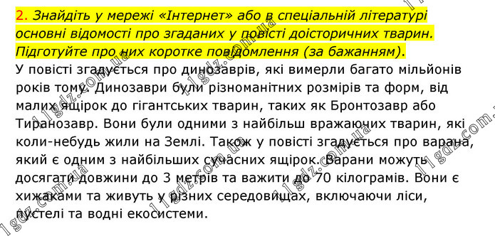 2. Знайдіть у мережі «Інтернет» або в спеціальній літературі основні відомості про згаданих у повісті доісторичних тварин. Підготуйте про них коротке повідомлення (за бажанням). У повісті згадується про динозаврів, які вимерли багато мільйонів років тому. Динозаври були різноманітних розмірів та форм, від малих ящірок до гігантських тварин, таких як Бронтозавр або Тиранозавр. Вони були одними з найбільш вражаючих тварин, які коли-небудь жили на Землі. Також у повісті згадується про варана, який є одним з найбільших сучасних ящірок. Варани можуть досягати довжини до 3 метрів та важити до 70 кілограмів. Вони є хижаками та живуть у різних середовищах, включаючи ліси, пустелі та водні екосистеми.