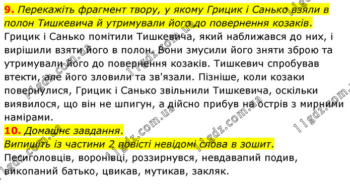 9. Перекажіть фрагмент твору, у якому Грицик і Санько взяли в полон Тишкевича й утримували його до повернення козаків. Грицик і Санько помітили Тишкевича, який наближався до них, і вирішили взяти його в полон. Вони змусили його зняти зброю та утримували його до повернення козаків. Тишкевич спробував втекти, але його зловили та зв'язали. Пізніше, коли козаки повернулися, Грицик і Санько звільнили Тишкевича, оскільки виявилося, що він не шпигун, а дійсно прибув на острів з мирними намірами. 10. Домашнє завдання. Випишіть із частини 2 повісті невідомі слова в зошит. Песиголовців, воронівці, роззирнувся, невдавапий подив, викопаний батько, цвикав, мутикав, закляк.