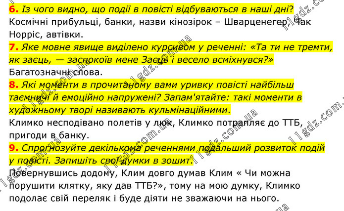 6. Із чого видно, що події в повісті відбуваються в наші дні? Космічні прибульці, банки, назви кінозірок – Шварценегер, Чак Норріс, автівки. 7. Яке мовне явище виділено курсивом у реченні: «Та ти не тремти, як заєць, — заспокоїв мене Заєць і весело всміхнувся?» Багатозначні слова. 8. Які моменти в прочитаному вами уривку повісті найбільш таємничі й емоційно напружені? Запам'ятайте: такі моменти в художньому творі називають кульмінаційними. Климко несподівано полетів у люк, Климко потрапляє до ТТБ, пригоди в банку. 9. Спрогнозуйте декількома реченнями подальший розвиток подій у повісті. Запишіть свої думки в зошит. Повернувшись додому, Клим довго думав Клим « Чи можна порушити клятку, яку дав ТТБ?», тому на мою думку, Климко подолає свій переляк і буде діяти не зважаючи на нього.