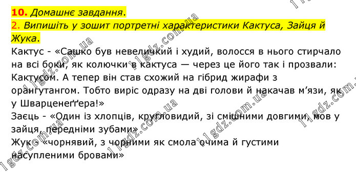 Домашнє завдання. 2. Випишіть у зошит портретні характеристики Кактуса, Зайця й Жука. Кактус - «Сашко був невеличкий і худий, волосся в нього стирчало на всі боки, як колючки в кактуса — через це його так і прозвали: Кактусом. А тепер він став схожий на гібрид жирафи з орангутангом. Тобто виріс одразу на дві голови й накачав м’язи, як у Шварценеґґера!» Заєць - «Один із хлопців, кругловидий, зі смішними довгими, мов у зайця, передніми зубами» Жук - «чорнявий, з чорними як смола очима й густими насупленими бровами»