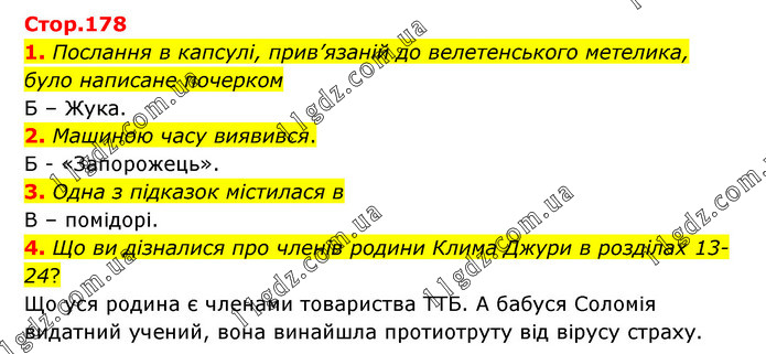 1. Послання в капсулі, прив’язаній до велетенського метелика, було написане почерком Б – Жука. 2. Машиною часу виявився. Б - «Запорожець». 3. Одна з підказок містилася в В – помідорі. 4. Що ви дізналися про членів родини Клима Джури в розділах 13-24? Що уся родина є членами товариства ТТБ. А бабуся Соломія видатний учений, вона винайшла протиотруту від вірусу страху.