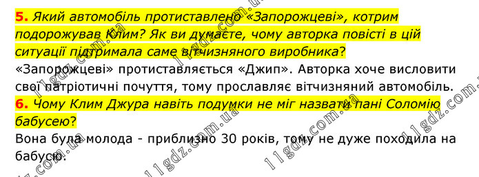5. Який автомобіль протиставлено «Запорожцеві», котрим подорожував Клим? Як ви думаєте, чому авторка повісті в цій ситуації підтримала саме вітчизняного виробника? «Запорожцеві» протиставляється «Джип». Авторка хоче висловити свої патріотичні почуття, тому прославляє вітчизняний автомобіль. 6. Чому Клим Джура навіть подумки не міг назвати пані Соломію бабусею? Вона була молода - приблизно 30 років, тому не дуже походила на бабусю.