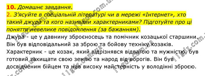Домашнє завдання. 2. З’ясуйте в спеціальній літературі чи в мережі «Інтернет», хто такий джура та кого називали характерниками? Підготуйте про ці поняття невелике повідомлення (за бажанням). Джура - це у давнину зброєносець та помічник козацької старшини. Він був відповідальний за зброю та бойову техніку козаків. Характерник - це козак, який відрізнявся відвагою та мужністю, був готовий захищати свою землю та народ від ворогів. Він був досвідченим бійцем та мав високу майстерність у володінні зброєю.