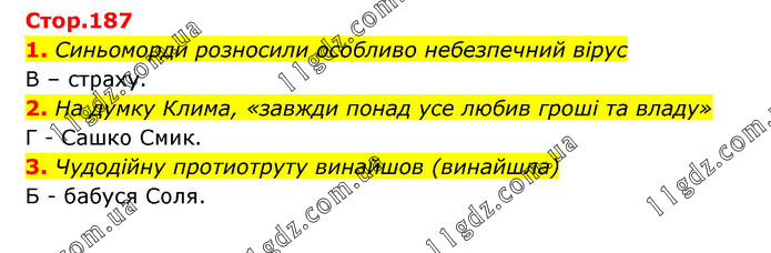 1. Синьоморди розносили особливо небезпечний вірус В – страху. 2. На думку Клима, «завжди понад усе любив гроші та владу» Г - Сашко Смик. 3. Чудодійну протиотруту винайшов (винайшла) Б - бабуся Соля.