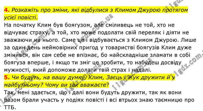 4. Розкажіть про зміни, які відбулися з Климом Джурою протягом усієї повісті. На початку Клим був боягузом, але сміливець не той, хто не відчуває страху, а той, хто може подолати свій переляк і діяти не зважаючи на нього. Саме це і відбувається з Климом Джурою. Лише за один день неймовірних пригод у товаристві боягузів Клим дуже змінився, він сам себе не впізнає, бо найскладніше зламати в собі боягуза вперше, і якщо ти зміг це зробити, то набудеш досвіду мужності, який допоможе долати твій страх і надалі. 5. Чи будуть, на вашу думку, Клим, Заєць і Жук дружити й у майбутньому? Чому ви так вважаєте? Так, мені здається, що і далі вони будуть дружити, так як вони разом брали участь у подіях повісті і всі втрьох знаю таємницю про ТТБ.