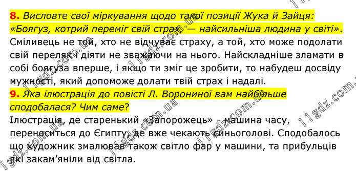 8. Висловте свої міркування щодо такої позиції Жука й Зайця: «Боягуз, котрий переміг свій страх, — найсильніша людина у світі». Сміливець не той, хто не відчуває страху, а той, хто може подолати свій переляк і діяти не зважаючи на нього. Найскладніше зламати в собі боягуза вперше, і якщо ти зміг це зробити, то набудеш досвіду мужності, який допоможе долати твій страх і надалі. 9. Яка ілюстрація до повісті Л. Ворониної вам найбільше сподобалася? Чим саме? Ілюстрація, де старенький «Запорожець» - машина часу, переноситься до Єгипту, де вже чекають синьоголові. Сподобалось що художник змалював також світло фар у машини, та прибульців які закам’яніли від світла.