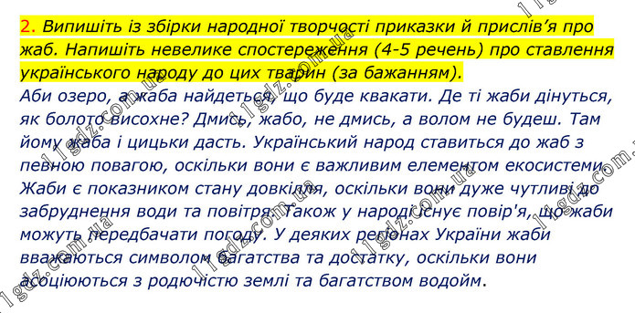 2. Випишіть із збірки народної творчості приказки й прислів’я про жаб. Напишіть невелике спостереження (4-5 речень) про ставлення українського народу до цих тварин (за бажанням). Аби озеро, а жаба найдеться, що буде квакати. Де ті жаби дінуться, як болото висохне? Дмись, жабо, не дмись, а волом не будеш. Там йому жаба і цицьки дасть. Український народ ставиться до жаб з певною повагою, оскільки вони є важливим елементом екосистеми. Жаби є показником стану довкілля, оскільки вони дуже чутливі до забруднення води та повітря. Також у народі існує повір'я, що жаби можуть передбачати погоду. У деяких регіонах України жаби вважаються символом багатства та достатку, оскільки вони асоціюються з родючістю землі та багатством водойм.