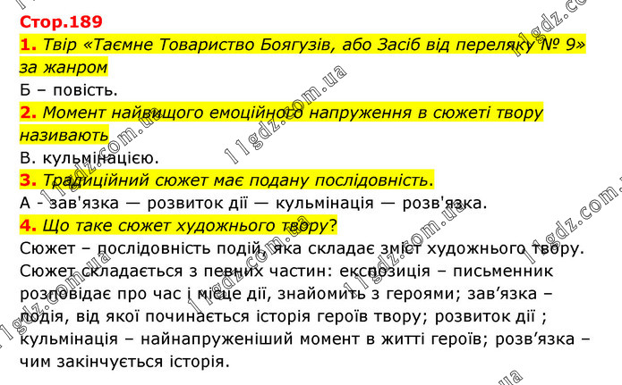 1. Твір «Таємне Товариство Боягузів, або Засіб від переляку № 9» за жанром Б – повість. 2. Момент найвищого емоційного напруження в сюжеті твору називають В. кульмінацією. 3. Традиційний сюжет має подану послідовність. А - зав'язка — розвиток дії — кульмінація — розв'язка. 4. Що таке сюжет художнього твору? Сюжет – послідовність подій, яка складає зміст художнього твору. Сюжет складається з певних частин: експозиція – письменник розповідає про час і місце дії, знайомить з героями; зав’язка –подія, від якої починається історія героїв твору; розвиток дії ; кульмінація – найнапруженіший момент в житті героїв; розв’язка – чим закінчується історія.