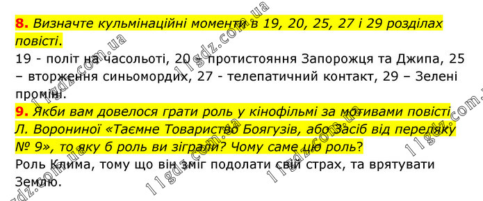 8. Визначте кульмінаційні моменти в 19, 20, 25, 27 і 29 розділах повісті. 19 - політ на часольоті, 20 – протистояння Запорожця та Джипа, 25 – вторження синьомордих, 27 - телепатичний контакт, 29 – Зелені проміні. 9. Якби вам довелося грати роль у кінофільмі за мотивами повісті Л. Ворониної «Таємне Товариство Боягузів, або Засіб від переляку № 9», то яку б роль ви зіграли? Чому саме цю роль? Роль Клима, тому що він зміг подолати свій страх, та врятувати Землю.
