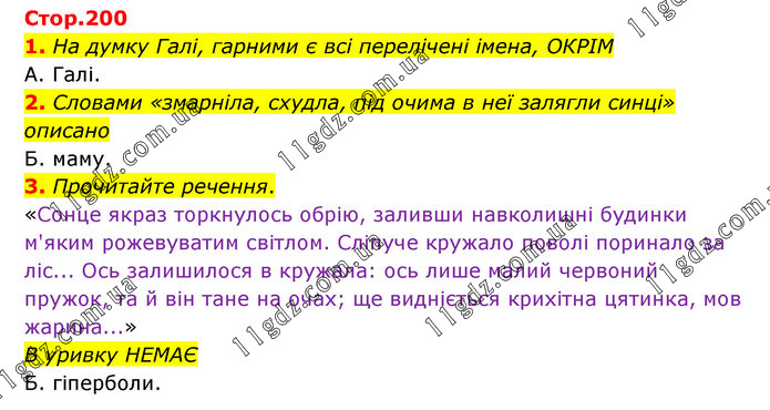 1. На думку Галі, гарними є всі перелічені імена, ОКРІМ А. Галі. 2. Словами «змарніла, схудла, під очима в неї залягли синці» описано Б. маму. 3. Прочитайте речення. «Сонце якраз торкнулось обрію, заливши навколишні будинки м'яким рожевуватим світлом. Сліпуче кружало поволі поринало за ліс... Ось залишилося в кружала: ось лише малий червоний пружок, та й він тане на очах; ще видніється крихітна цятинка, мов жарина...» В уривку НЕМАЄ Б. гіперболи.