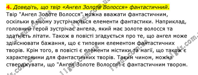Доведіть, що твір «Ангел Золоте Волосся» фантастичний. Твір "Ангел Золоте Волосся" можна вважати фантастичним, оскільки в ньому зустрічаються елементи фантастики. Наприклад, головний герой зустрічає ангела, який має золоте волосся та здатність літати. Також в повісті згадується про те, що ангел може здійснювати бажання, що є типовим елементом фантастичних творів. Крім того, в повісті є елементи містики та магії, що також є характерними для фантастичних творів. Таким чином, можна стверджувати, що "Ангел Золоте Волосся" є фантастичним твором.