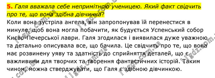 Галя вважала себе непримітною ученицею. Який факт свідчить про те, що вона здібна дівчинка? Коли вона зустріла ангела, він запропонував їй перенестися в минуле, щоб вона могла побачити, як будується Успенський собор Києво-Печерської лаври. Галя згодилася і виявилася дуже уважною та детально описувала все, що бачила. Це свідчить про те, що вона має розвинену уяву та здатність до сприйняття деталей, що є важливими для творчих та творення фантастичних історій. Таким чином, можна стверджувати, що Галя є здібною дівчинкою.