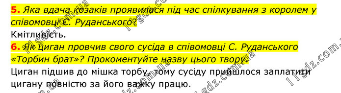 5. Яка вдача козаків проявилася під час спілкування з королем у співомовці С. Руданського? Кмітливість. 6. Як циган провчив свого сусіда в співомовці С. Руданського «Торбин брат»? Прокоментуйте назву цього твору. Циган підшив до мішка торбу, тому сусіду прийшлося заплатити цигану повністю за його важку працю.