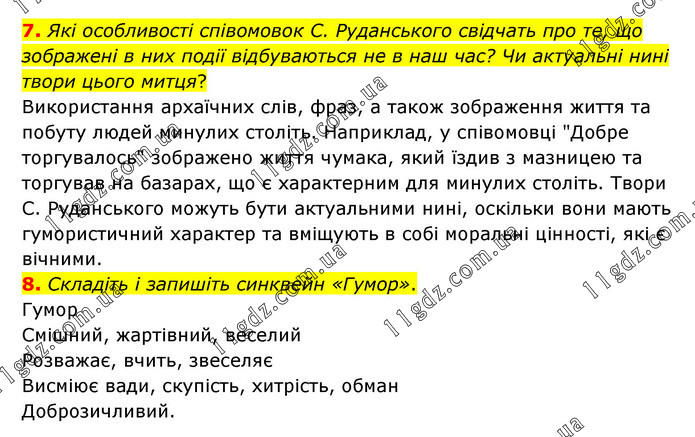 7. Які особливості співомовок С. Руданського свідчать про те, що зображені в них події відбуваються не в наш час? Чи актуальні нині твори цього митця? Використання архаїчних слів, фраз, а також зображення життя та побуту людей минулих століть. Наприклад, у співомовці "Добре торгувалось" зображено життя чумака, який їздив з мазницею та торгував на базарах, що є характерним для минулих століть. Твори С. Руданського можуть бути актуальними нині, оскільки вони мають гумористичний характер та вміщують в собі моральні цінності, які є вічними. 8. Складіть і запишіть синквейн «Гумор». Гумор Смішний, жартівний, веселий Розважає, вчить, звеселяє Висміює вади, скупість, хитрість, обман Доброзичливий.