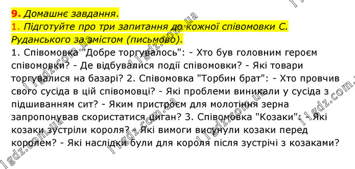 Домашнє завдання. 1. Підготуйте про три запитання до кожної співомовки С. Руданського за змістом (письмово). 1. Співомовка "Добре торгувалось": - Хто був головним героєм співомовки? - Де відбувалися події співомовки? - Які товари торгувалися на базарі? 2. Співомовка "Торбин брат": - Хто провчив свого сусіда в цій співомовці? - Які проблеми виникали у сусіда з підшиванням сит? - Яким пристроєм для молотіння зерна запропонував скористатися циган? 3. Співомовка "Козаки": - Які козаки зустріли короля? - Які вимоги висунули козаки перед королем? - Які наслідки були для короля після зустрічі з козаками?