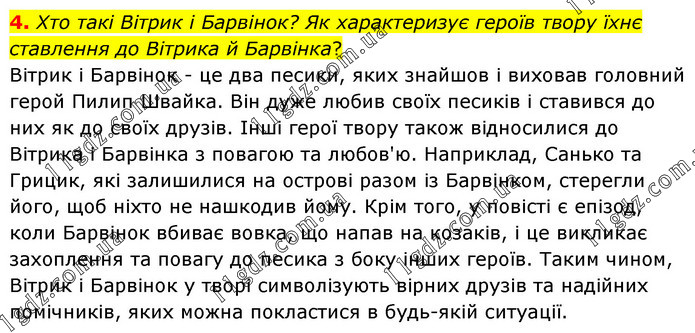 4. Хто такі Вітрик і Барвінок? Як характеризує героїв твору їхнє ставлення до Вітрика й Барвінка? Вітрик і Барвінок - це два песики, яких знайшов і виховав головний герой Пилип Швайка. Він дуже любив своїх песиків і ставився до них як до своїх друзів. Інші герої твору також відносилися до Вітрика і Барвінка з повагою та любов'ю. Наприклад, Санько та Грицик, які залишилися на острові разом із Барвінком, стерегли його, щоб ніхто не нашкодив йому. Крім того, у повісті є епізод, коли Барвінок вбиває вовка, що напав на козаків, і це викликає захоплення та повагу до песика з боку інших героїв. Таким чином, Вітрик і Барвінок у творі символізують вірних друзів та надійних помічників, яких можна покластися в будь-якій ситуації.